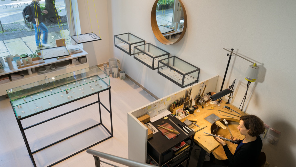 In meiner Ladenwerkstatt entstehen von der Idee bis zur handwerklichen Herstellung eigene Schmuckkollektionen und Trauringe. Desweiteren werden zeitgenössischer Schmuck und edles Porzellan aus regionalen und überregionalen kleinen Ateliers, Manufakturen und Studios präsentiert und verkauft.