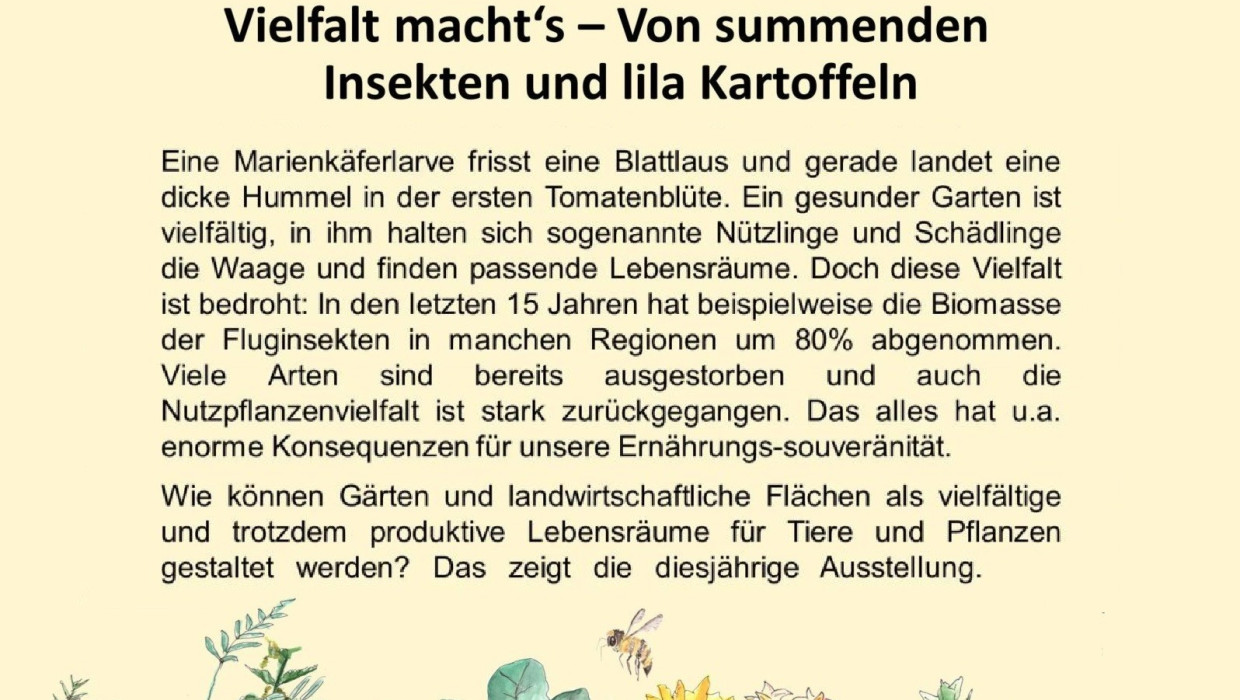 Wie können Gärten und landwirtschaftliche Flächen als vielfältige und trotzdem produktive Lebensräume für Tiere und Pflanzen gestaltet werden? – In der gepflanzten und beschilderten Ausstellung findet ihr Anregungen und Antworten.
