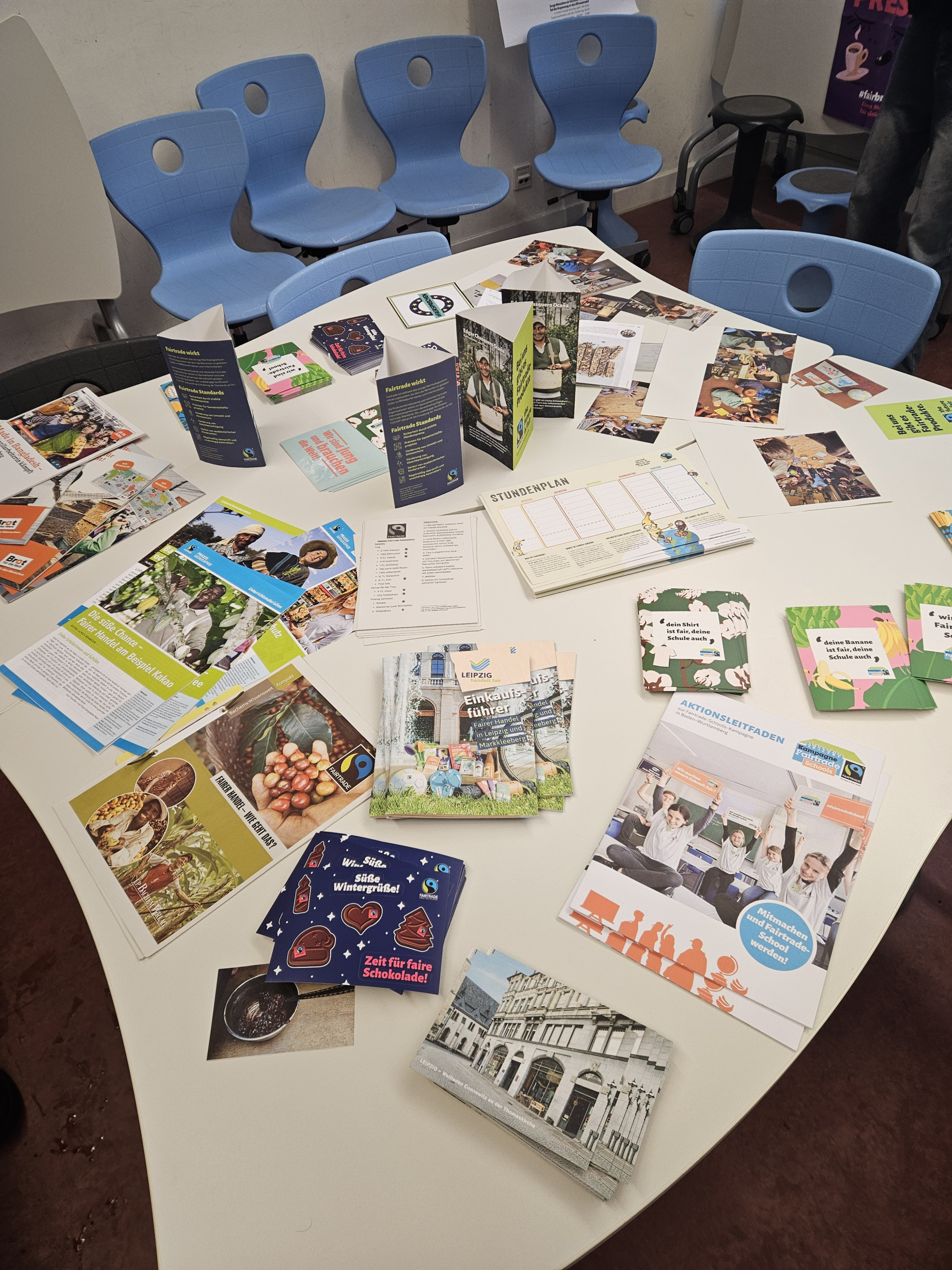 Somit stürzten wir uns in die Gestaltung des Fairtrade-Raumes im Haus A. Neben einem Tisch mit unterschiedlichsten Fairtrade-Produkten gab es auch Informationsmaterial zum fairen Handel, Postkarten, Rezepthefte, einen Einkaufsführer zum fairen Handel in Leipzig, Lesezeichen und vieles mehr. An einem anderen Tisch durfte gerätselt werden: Wer kann die meisten fairen Produkte dem richtigen Kontinent zuordnen? Wer richtig lag, durfte sich ein Stück faire Schokolade zur Belohnung schmecken lassen. Somit konnten wir neugierigen Kindern und deren Eltern die Bedeutung des fairen Handels FAIRmitteln.